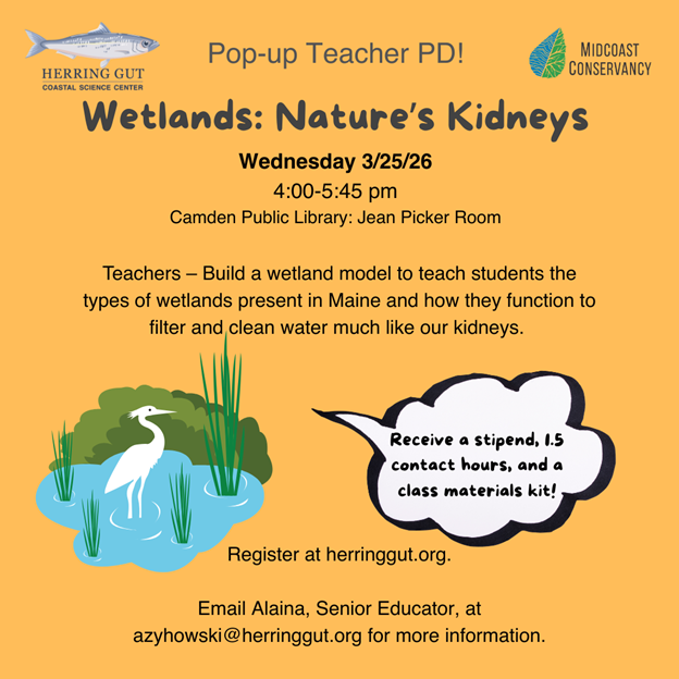 Join Herring Gut Coastal Science Center and Midcoast Conservancy for this pop-up teacher professional development workshop focused on the importance of wetlands.