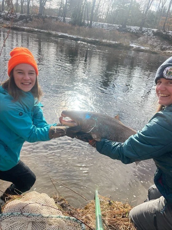 Melissa Cote and Jen Noll hold adult Atlantic salmon